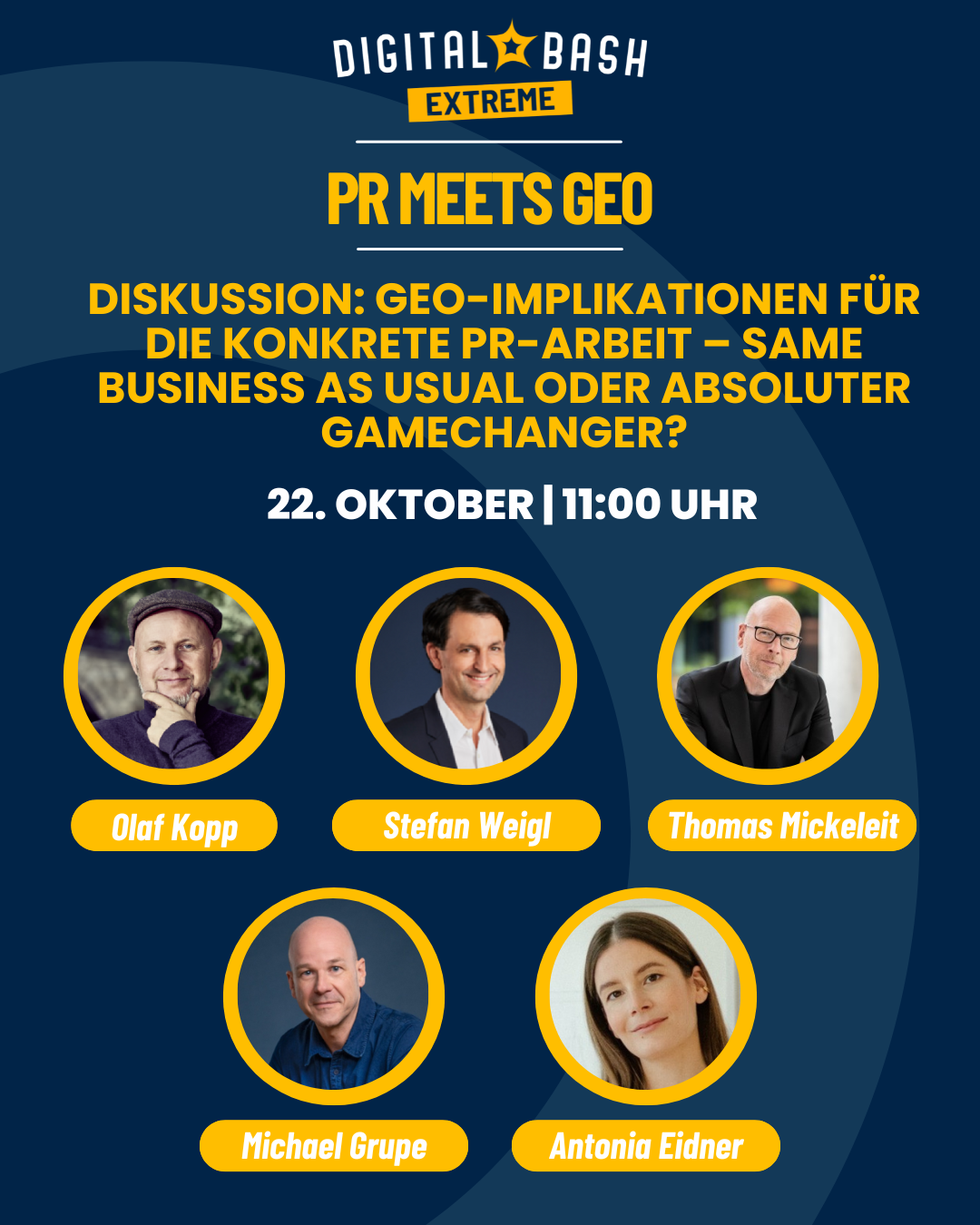 Im Digital Bash EXTREME – PR meets GEO zeigen dir unsere Expert:innen, wie du mit PR Sichtbarkeit in KI-Suchen aufbaust.